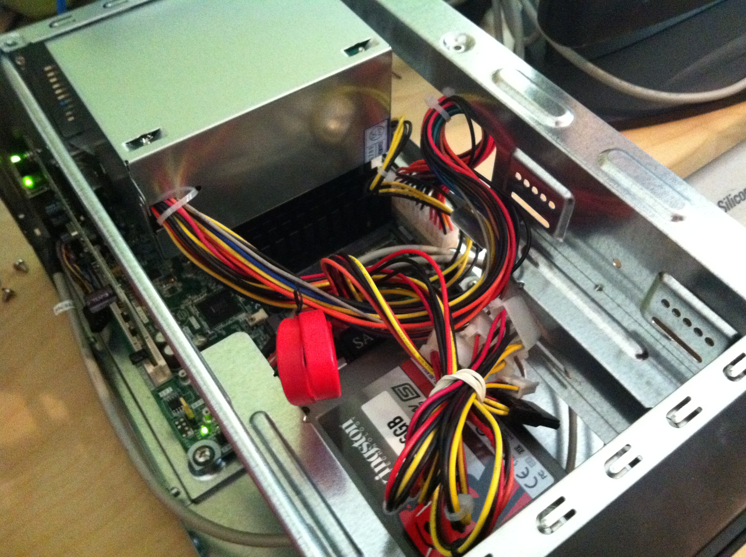 Installation is fairly straightforward, though I’m not sure if I’d use the same case if I did it again. I needed a case with a PCI slot (there are PCI Express Mini Full ethernet cards, but they’re really expensive and rare), and there aren’t many that don’t include a full-size CD-ROM bay. The case is probably twice as big as it needs to be. You mount the motherboard with four screws, plug in two power supply connectors, slot the PCI card, slot the memory, plug in the front-panel connectors and the SSD’s SATA cable, mount the SSD somehow (I just screwed it in on one side), plug an SATA power cable into the SSD and you’re done.